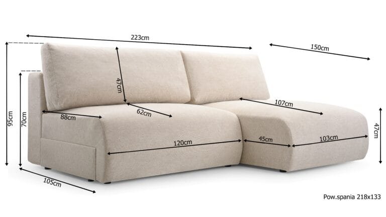 WIDTH 223cm / DEPTH 150cm / SEAT HEIGHT 47cm / MAXIMUM CORNER HEIGHT 95cm / SLEEPING AREA 218 x 133cm